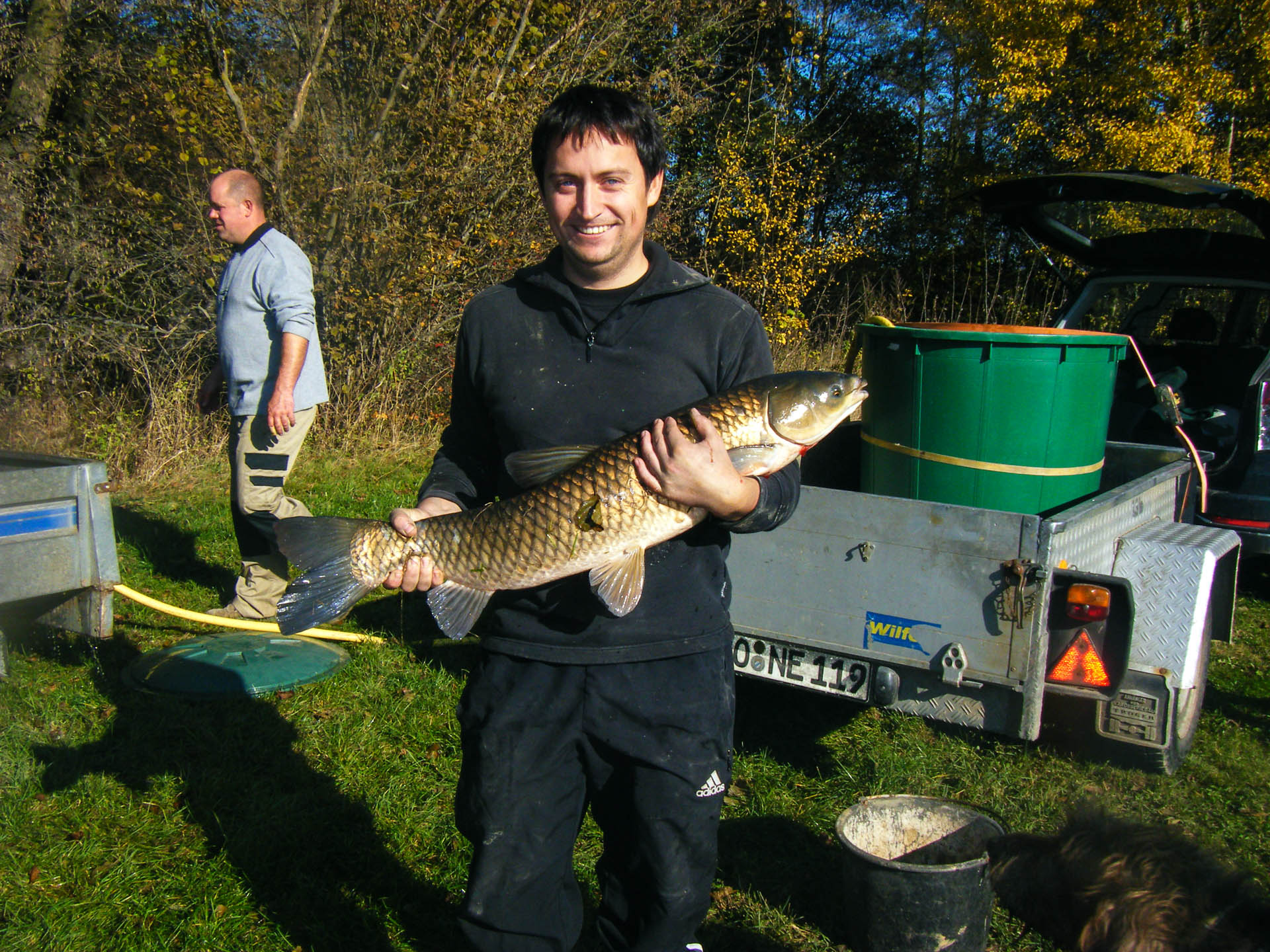 Besonders spannend war, was im abgelassenen Teich zum Vorschein kommen würde und hier konnte als besonderer Fang ein Graskarpfen an Land geholt werden.