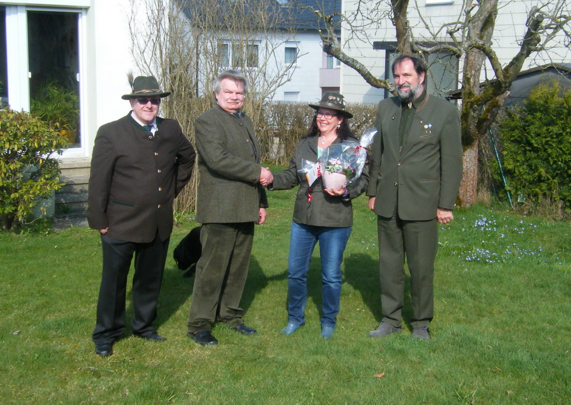 Unsere Ausbilderin im Fach Jagdhundewesen, Michaela Stark, feierte am 06.04.2016 ihren 50. Geburtstag. 1. Vorsitzender Armin Hohmann überbrachte die besten Wünsche und übergab ein kleines Präsent. Unterstützt wurde er dabei durch unseren 2. Vorsitzenden Wolfgang Schopper und Schatzmeister Hans-Jürgen Rosar sowie unsere Jagdhornbläser.