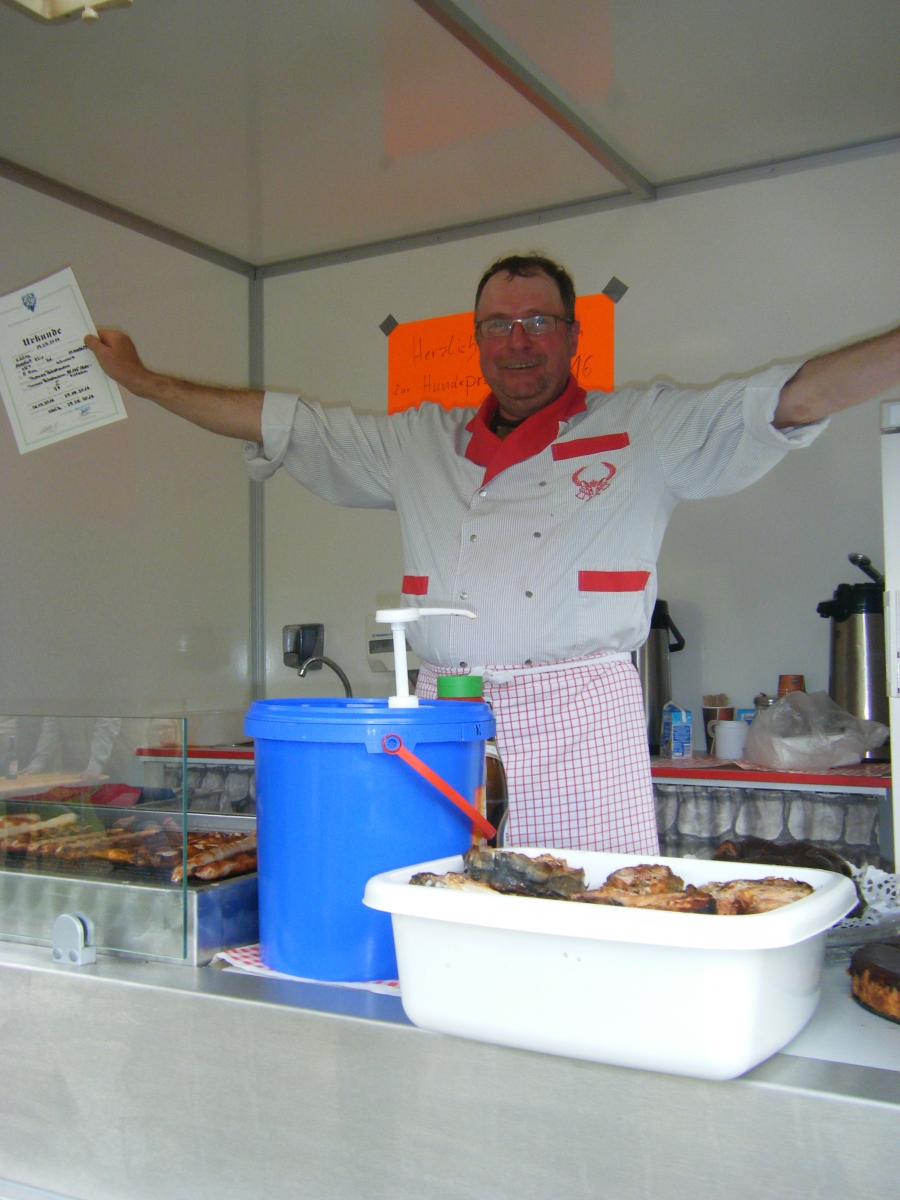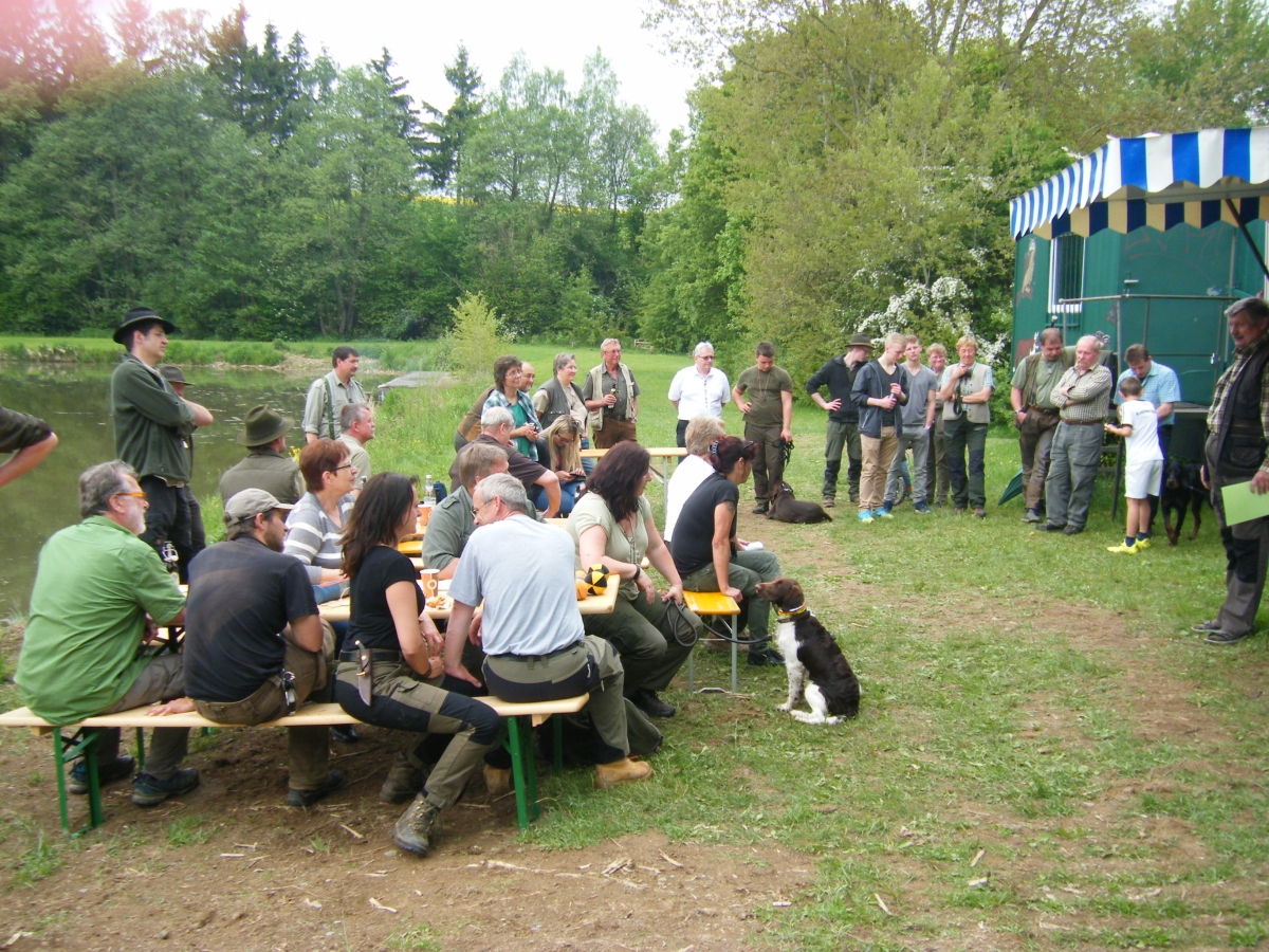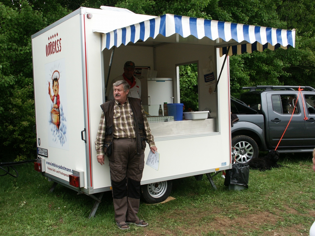 Thomas Papstmann, der sicher vielen mit seinem Imbisswagen am Hofer Rathaus oder vom Hofer Volksfest bekannt ist, nahm mit seinem erst vier Monate alten Hund an der Dressurprüfung teil. Aus Freude am Kurs hatte er sich bereit erklärt, seinen Imbisswagen in Köditz aufzustellen und die Bewirtung der Teilnehmer und Gäste zu übernehmen. So gab es an diesem Tag verschiedene Bratwurstsorten, Steaks und den von Gertraud und Hartmut Opitz geräucherten Graskarpfen aus dem Köditzer Teich. Aber das war noch nicht alles. Denn der Erlös aus dem Verkauf der Speisen in Höhe von 238,00 € wurde uns von Herrn Papstmann für Naturschutzzwecke gespendet. Herzlichen Dank von hier aus an nochmals an ihn für seinen Arbeitseinsatz und die großzügige Zuwendung.