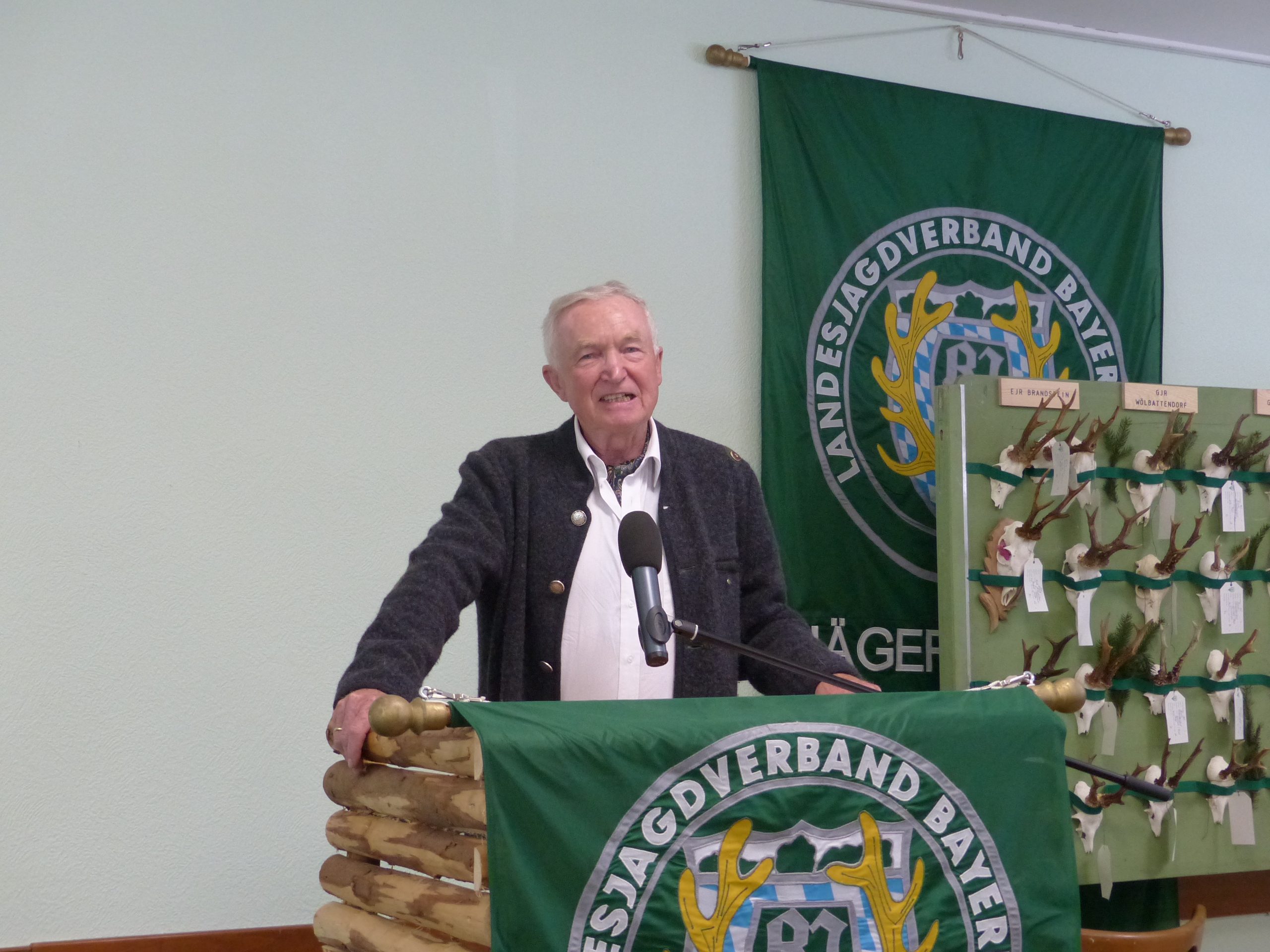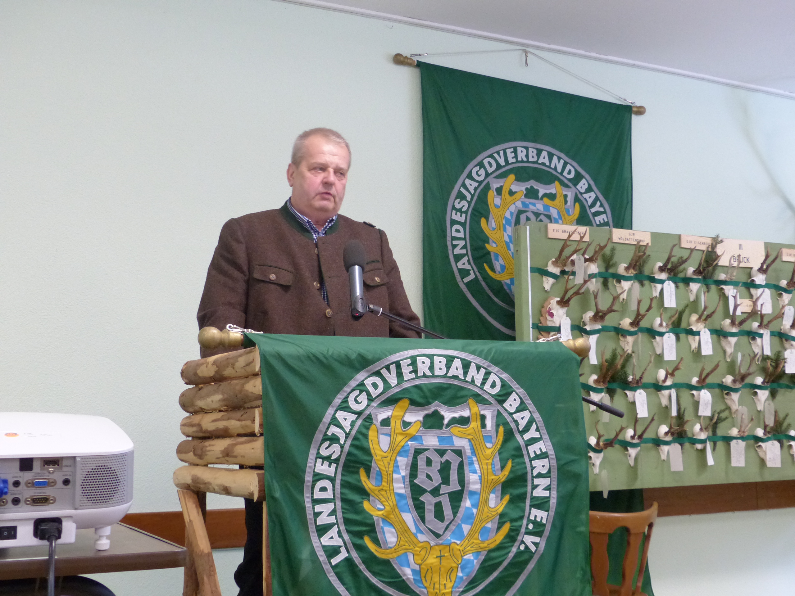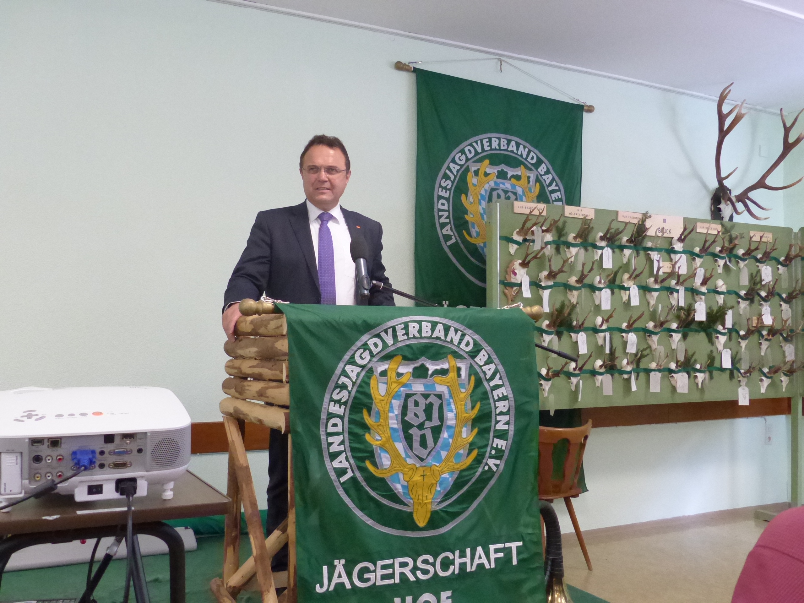In seiner Begrüßungsrede führte Hohmann aus, dass die Jäger ihrer durch Gesetz gegebenen Verantwortung zur Hege und Pflege der Natur in einem großen Umfang gerecht werden würden. Als zusätzliche Herausforderung für die Jagd in den nächsten Jahren, nannte er den Zuzug des Wolfs in den oberfränkischen Revieren, da in letzter Zeit schon mehrfach männliche und weibliche Tiere im Bayerischen Wald, im Bereich des Truppenübungsplatzes Grafenwöhr und auch in der Hofer Region gesichtet wurden. Die dauerhafte Ansiedlung des Wolfs werde sich auf die Bejagung des Schalenwildes, hier vor allem auf die des Rot- und Rehwildes, stark auswirken. Niemand könne aber jetzt schon vorhersagen, so Hohmann, wie sich die jagdliche Situation in Hochfranken durch den Wolf verändere. Die in den östlichen Bundesländern gemachten Erfahrungen würden aber zeigen, dass dies nicht ohne Konflikte zwischen Nutztierhaltern bzw. Jägern auf der einen und den Befürwortern der Wolfansiedlung auf der anderen Seite, ablaufen werde.
