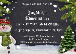 Zur Einstimmung auf die Adventszeit und das bevorstehende Weihnachtsfest, veranstaltet die Jägerschaft Hof am kommenden Sonntag, den 17.12., in ihrem Jägerheim in der Ostendstraße 3 im Hofer Ortsteil Jägersruh, eine jagdliche Adventsfeier. Beginn der Veranstaltung ist um 14.00 Uhr und es wird Wildspezialitäten wie etwa Wildbratwürste und Wildleberkäse geben. Aber auch für Kaffee und diverse Kuchen wird gesorgt. Außerdem findet ein kleiner Weihnachtsmarkt statt und die Hofer Jagdhornbläser sorgen ab 16.00 Uhr für weihnachtliche Stimmung. Die Mitglieder der Jägerschaft Hof und die interessierte Bevölkerung sind dazu herzlich eingeladen.