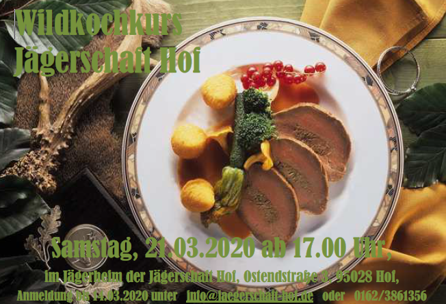 Der Kochkurs findet am 21. März 2020 im Vereinsheim der Jägerschaft Hof, Ostendstraße 3, 95028 Hof-Jägersruh, statt; Beginn ist um 17.00 Uhr. Für die Teilnahme fällt ein Kostenbeitrag in Höhe von 50,00 € an. Am anschließenden Verspeisen des Menüs kann eine 2. Person teilnehmen. Verbindliche Anmeldungen für den Kochkurs unter info@jaegerschaft-hof.de oder 0162/3861356. Nachdem der Kreis der Teilnehmer auf 20 Personen beschränkt ist, wird um Meldung bis spätestens 14.03.2020 gebeten.