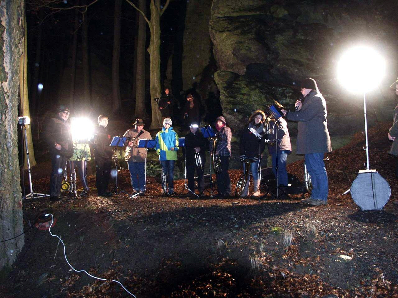 Waldweihnacht in den Felsen der Fattigsmühle und der ScheuneWahrscheinlich lag es wieder am schlechten Wetter, dass unsere Waldweihnacht in diesem Jahr nicht den erhofften Besucherandrang zeigte. Trotzdem war es aber wieder ein schöner Jahresabschluss, der unter den Klängen unserer Jagdhornbläser und des Posaunenchores Joditz in den Felsen oberhalb der Fattigsmühle stattfand.