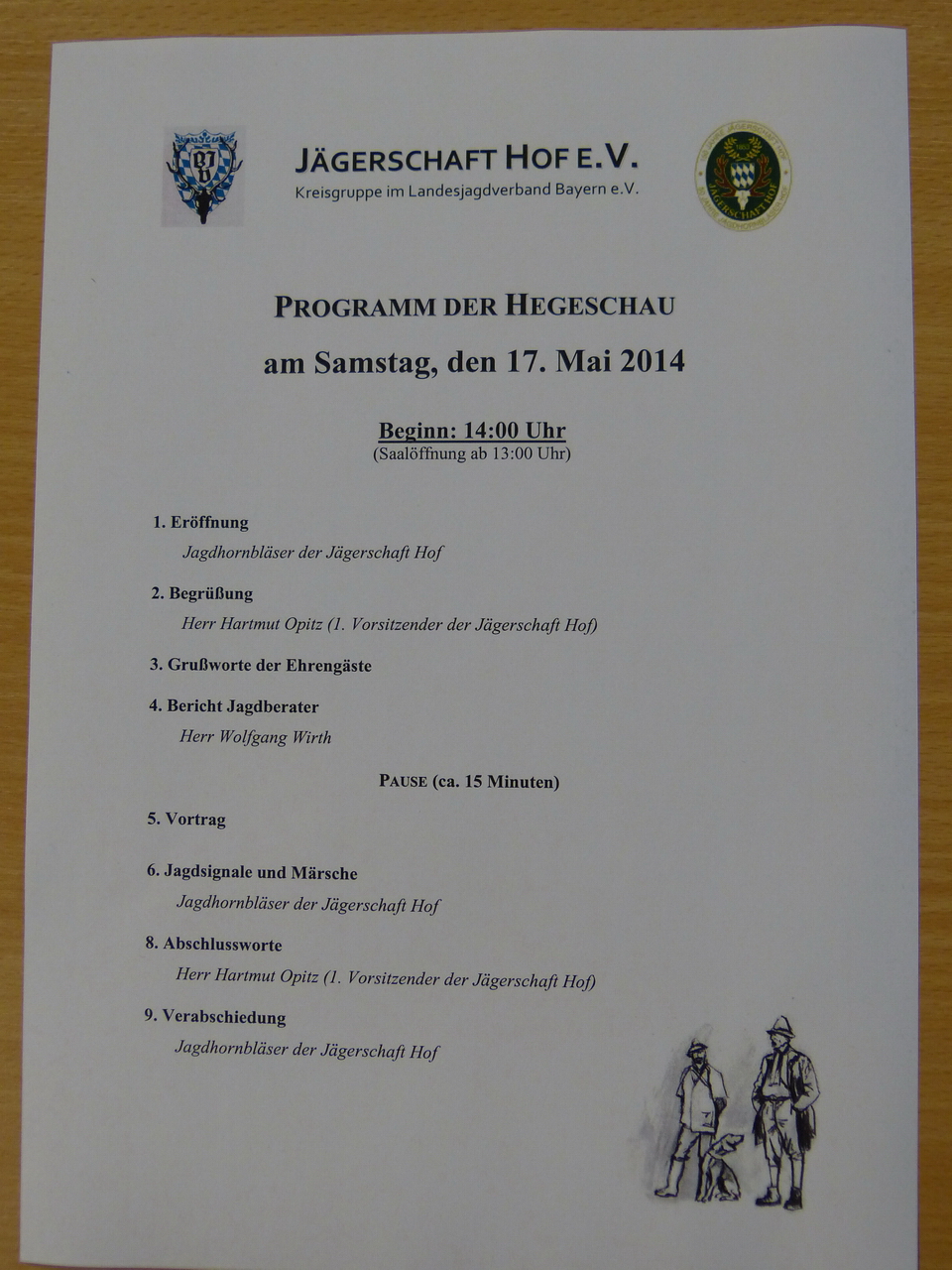 Am 17. Mai 2014 trafen sich die Revierinhaber der Hegeringe 3 bis 6 in der Gaststätte Alsenberger Keller zur vom Landkreis und der Stadt Hof angeordneten Hegeschau. Nach Eröffnung durch unsere Jagdhornbläser, begrüßte 1. Vorsitzender Hartmut Opitz die anwesenden Ehrengäste, darunter MdL König, den BJV-Regierungsbezirksvorsitzenden Prof. Dr. Wunderatsch, Jagdberater Wolfgang Wirth, Herrn Forstpräsidenten a.D. Dr. Klein und den neuen Vorsitzenden der Kreisgruppe Naila, Stefan Eul. Entschuldigt hatten sich aus terminlichen Gründen Herr Oberbürgermeister Dr. Fichtner von der Stadt Hof und Herr Landrat Dr. Oliver Bär.