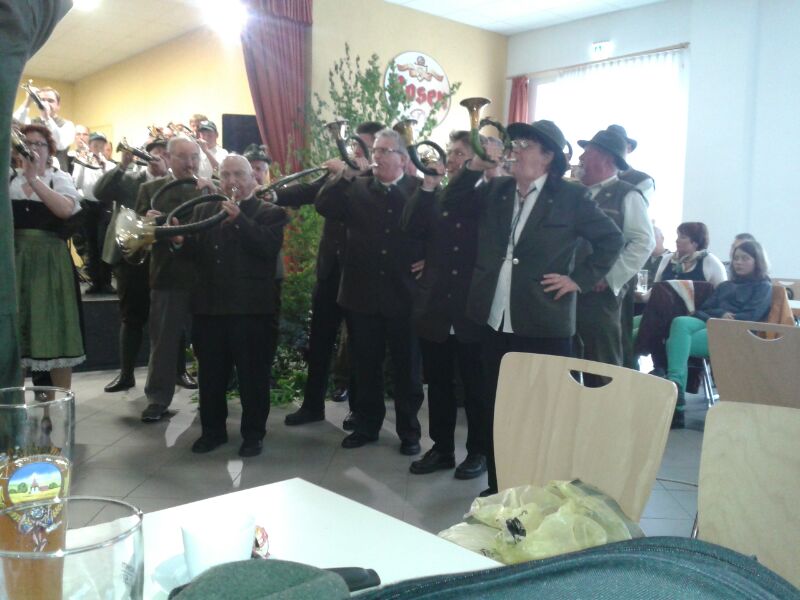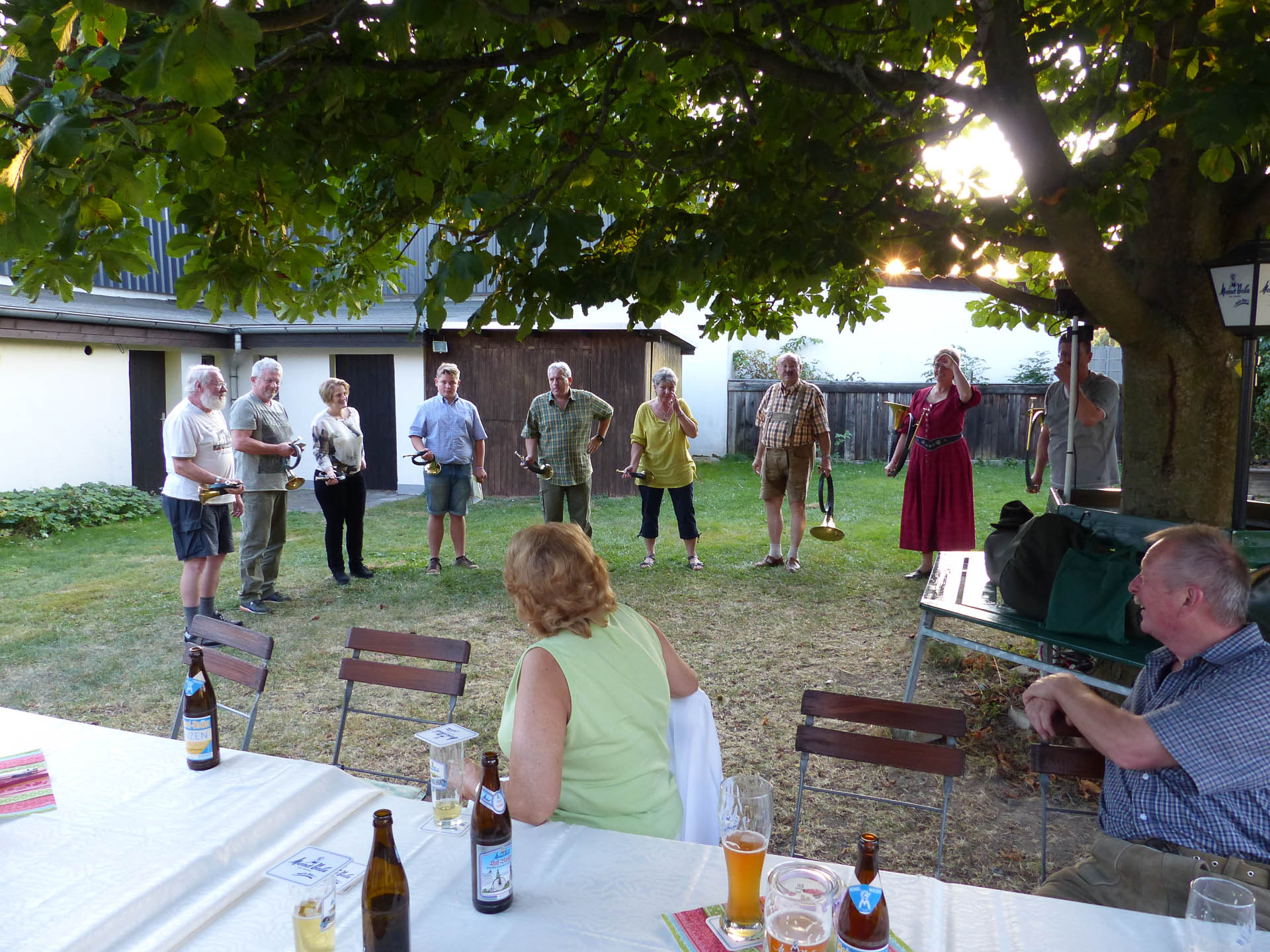 Bild einer Probe, wie sie auch sein kann. Obwohl wir Sommerpause hatten, trafen sich einige Bläser mit den Parforcehörnern am 4.8.15 zur Probe im Jägerheim. Trotz Pause kamen dann nahezu alle Bläser zum Blasen und anschließender Brotzeit.