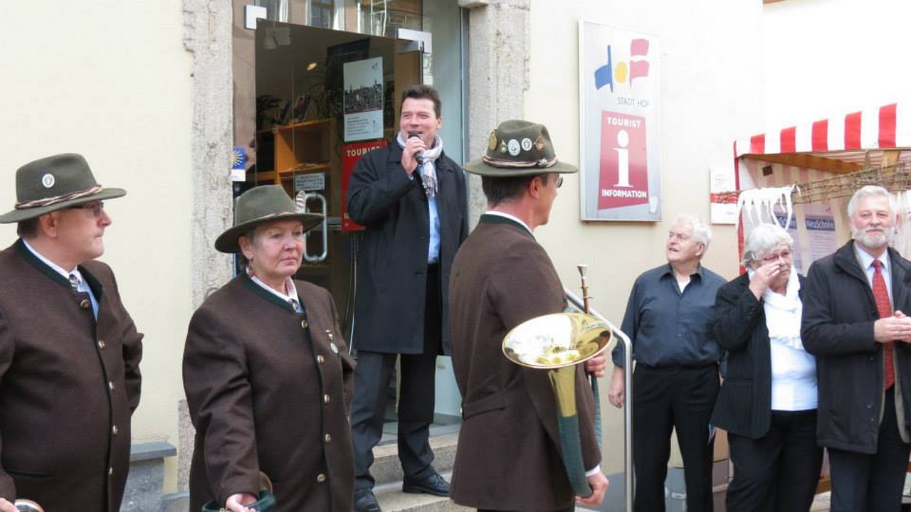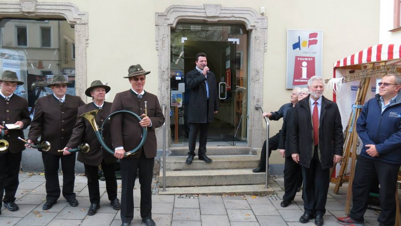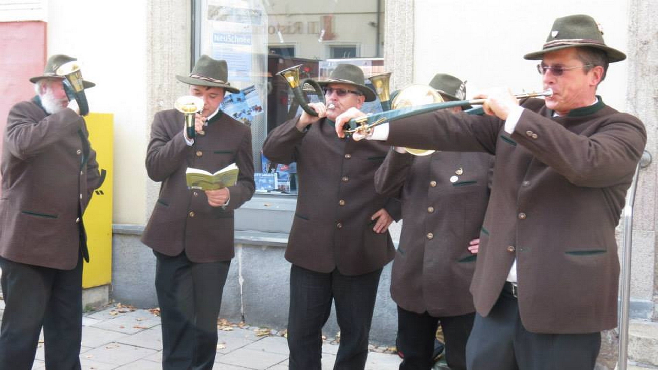 Zur Wintersportmesse „NeuSchnee“ am 27. Oktober 2013, dem „Filmtage-Sonntag“, präsentierten sich die Jagdhornbläser der Jägerschaft Hof in der Hofer Ludwigstraße.
